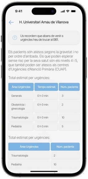 Permet accedir ràpidament a la informació dels serveis d’urgències i consultar en temps real els temps d’espera per planificar millor la visita.