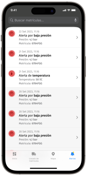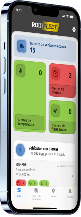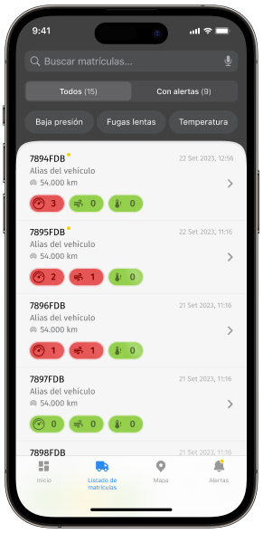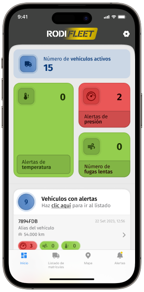 Una vez iniciada la sesión, cada usuario se encontrará con un dashboard resumen de su flota: número de vehículos activos, alertas de temperatura, de presión y de fuga lenta y un listado de los camiones afectados.