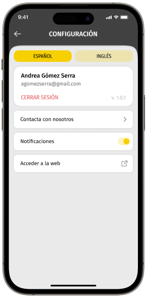 El apartado de configuración permite a los usuarios cambiar el idioma y realizar diferentes acciones como cerrar sesión o contactar con la empresa.
