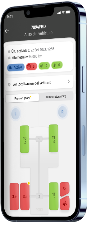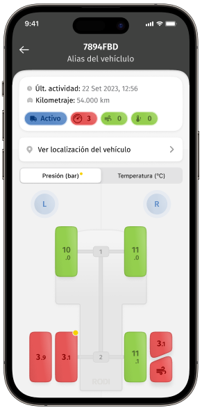 En la ficha individual de cada camión se pueden visualizar datos como: matrícula, kilometraje, localización y además, la presión y temperatura de cada uno de los neumáticos representados con una ilustración. Si uno de los datos sobrepasa el límite establecido, se marcaría en rojo para hacer visible la alerta.