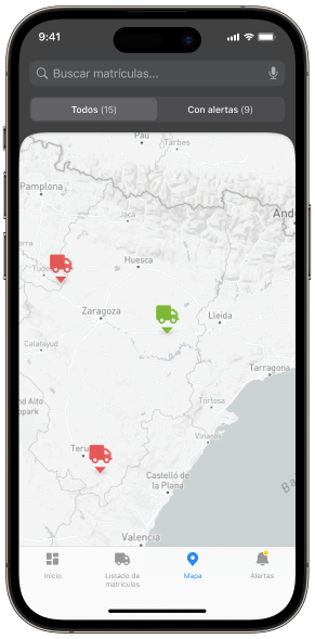 Aquí podemos encontrar un mapa actualizado a tiempo real con la localización de toda la flota de vehículos. Resaltado en rojo si tiene incidencias o en verde si no. Al pulsar sobre el marcador podríamos acceder al detalle.